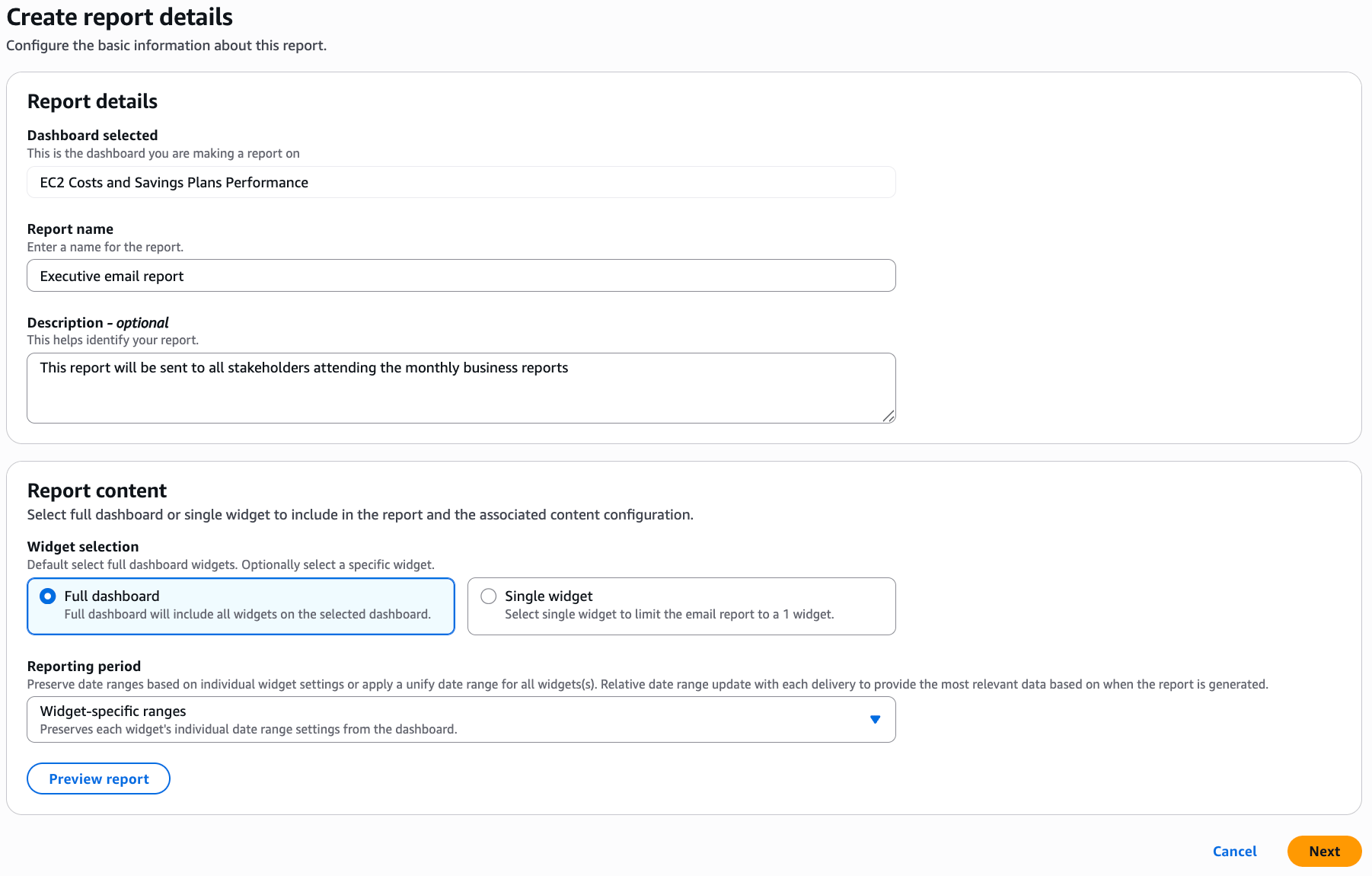You can send entire dashboards for executive reviews or specific widgets (e.g., just EC2 costs) for engineering teams.