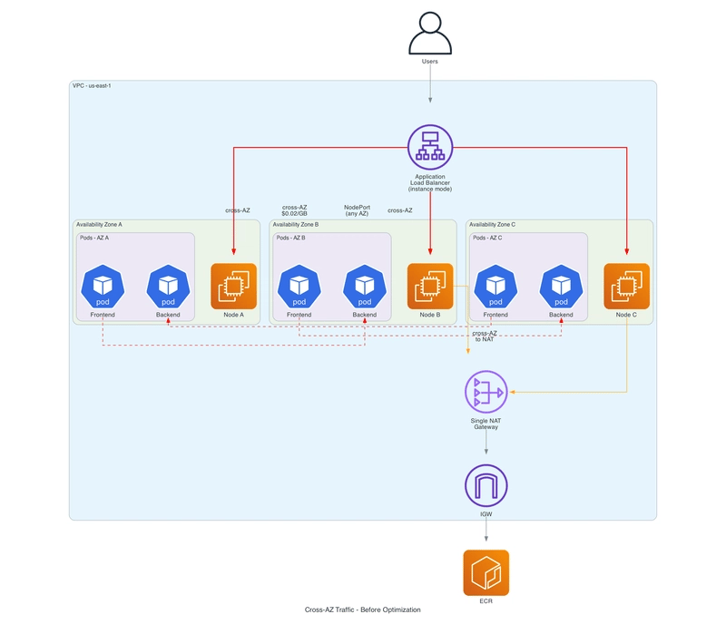 By default, traffic in Amazon EKS is zone-agnostic. In a 3 Availability Zone (AZ) cluster, 67% of traffic unnecessarily crosses AZ boundaries, costing $0.02/GB (round trip). At a scale of 50 TB/month, this results in over $300/month in avoidable spend.